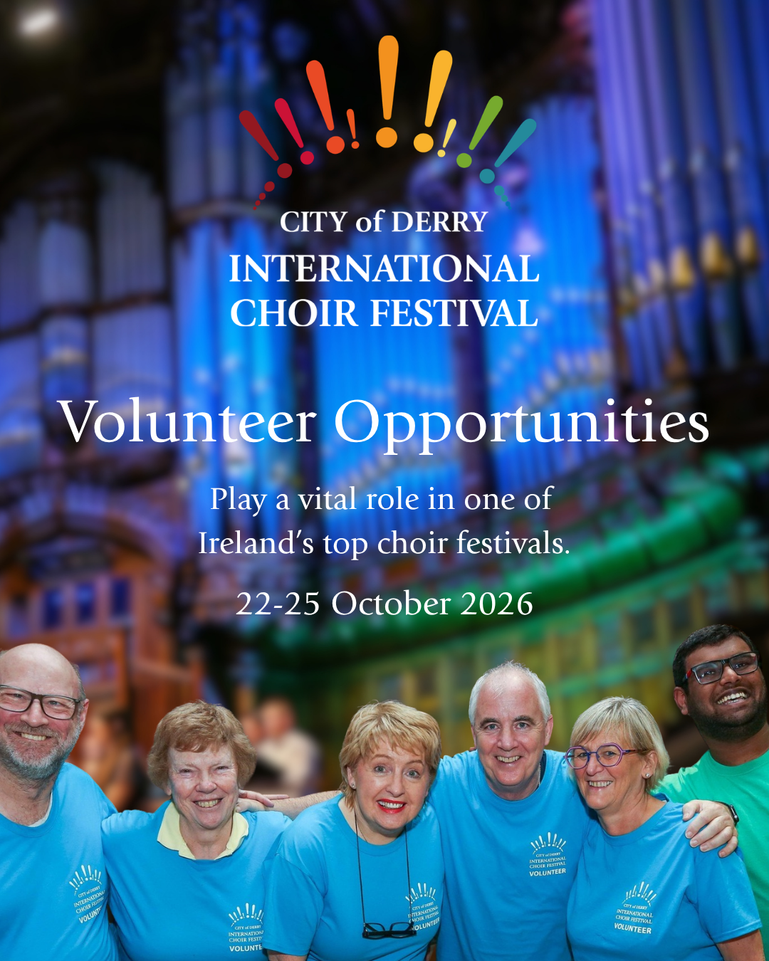 The City of Derry International Choir Festival is one of Ireland's leading choral celebrations, bringing together world-class choirs, local talent, and vibrant audiences. The festival relies on a dedicated team of volunteers each year, it's success is truly powered by those willing to lend a hand. Roles include stewarding, ushering, selling programmes and merchandise, guiding choirs, meeting and greeting guests and supporting the smooth flow of performers and audiences. It's a brilliant opportunity to gain event experience, meet people from around the world and play a key role in delivering an unforgettable cultural event.